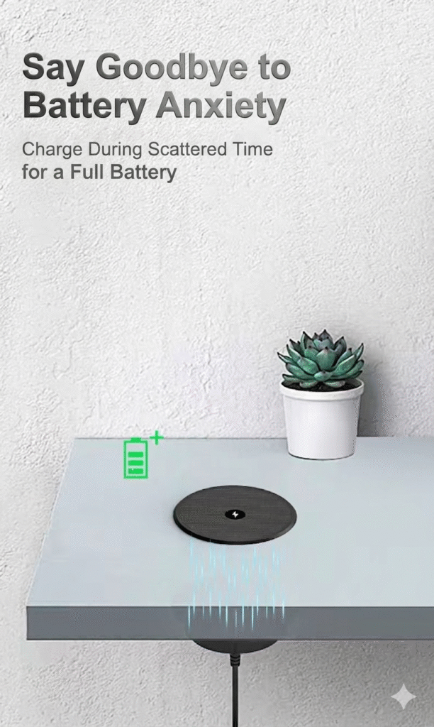 Top-Down Flush Mount: Visible as a sleek, low-profile disc on the desk surface. Best for public areas where the user needs to see exactly where to place their phone.
